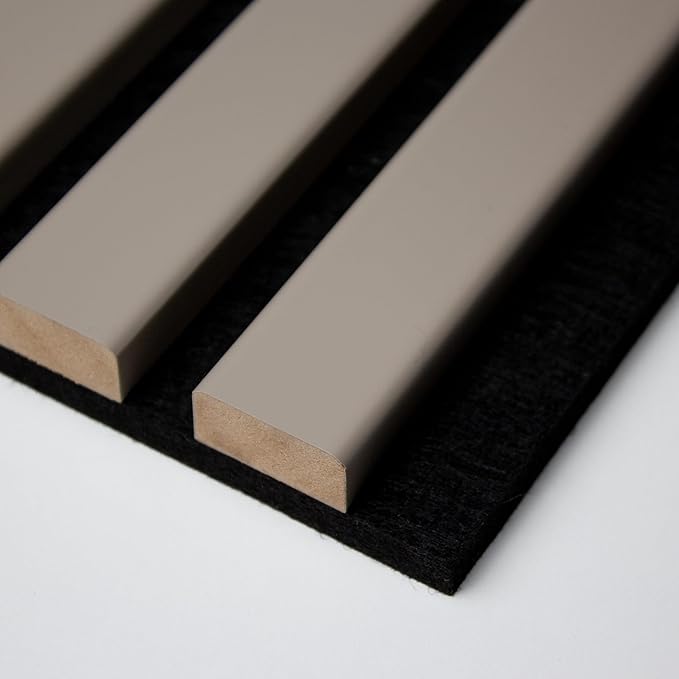 Die Grundlage des Produkts bildet eine 9 mm dicke Filzplatte, während die Oberfläche aus 12 mm dicken MDF-Lamellen besteht. Diese Lamellen haben eine Breite von 27 mm und einen Abstand von etwa 13 mm.