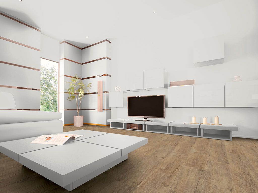 Die Optik der Laminatdielen sorgt für eine harmonische und zeitlose Raumwirkung und lässt sich vielseitig mit verschiedenen Einrichtungsstilen kombinieren – von modern bis klassisch.