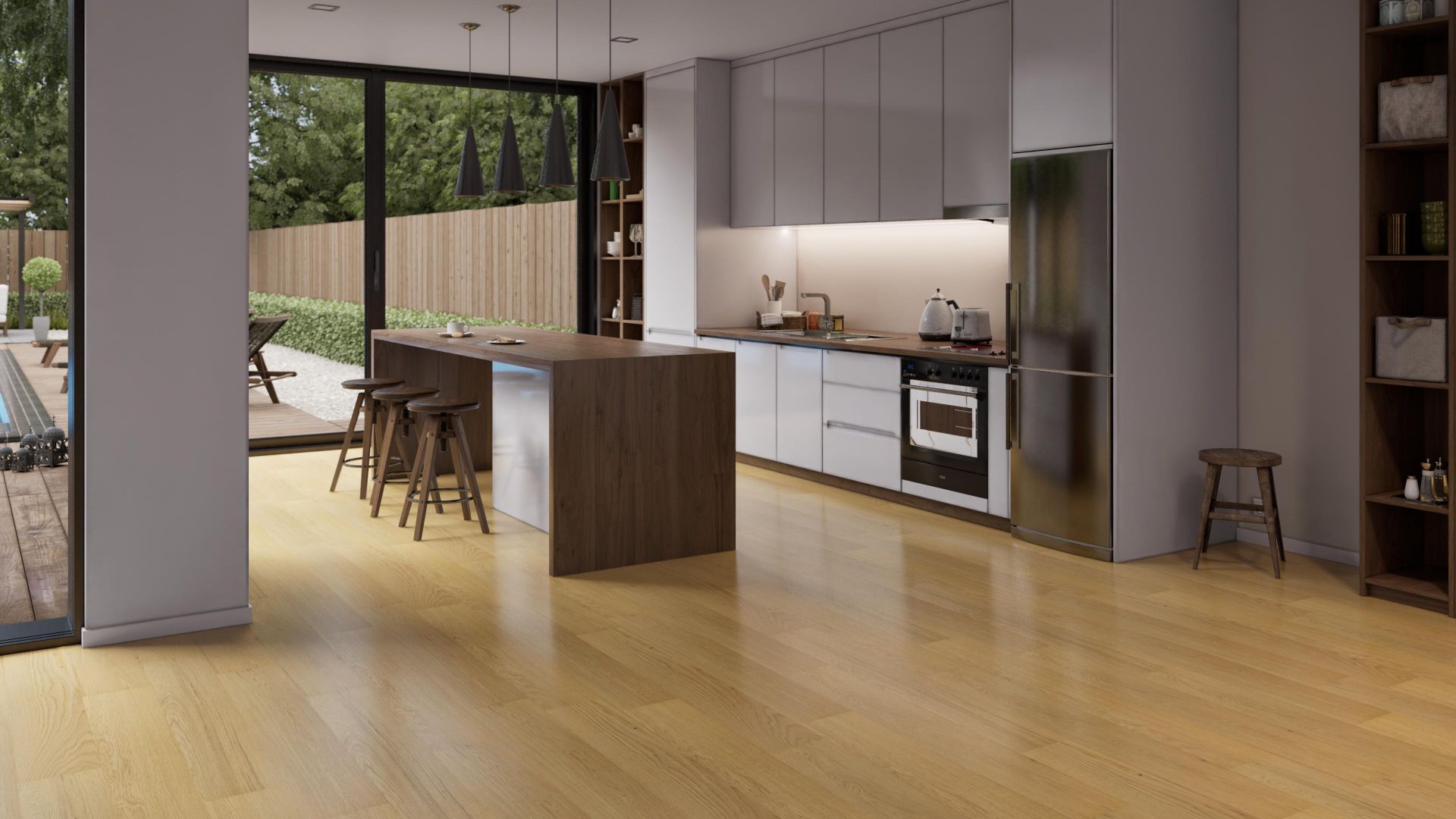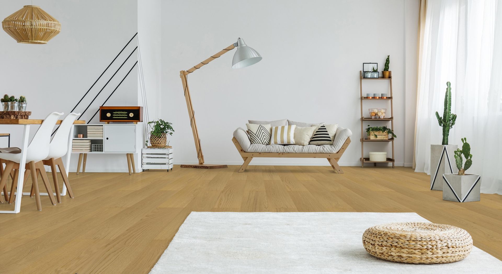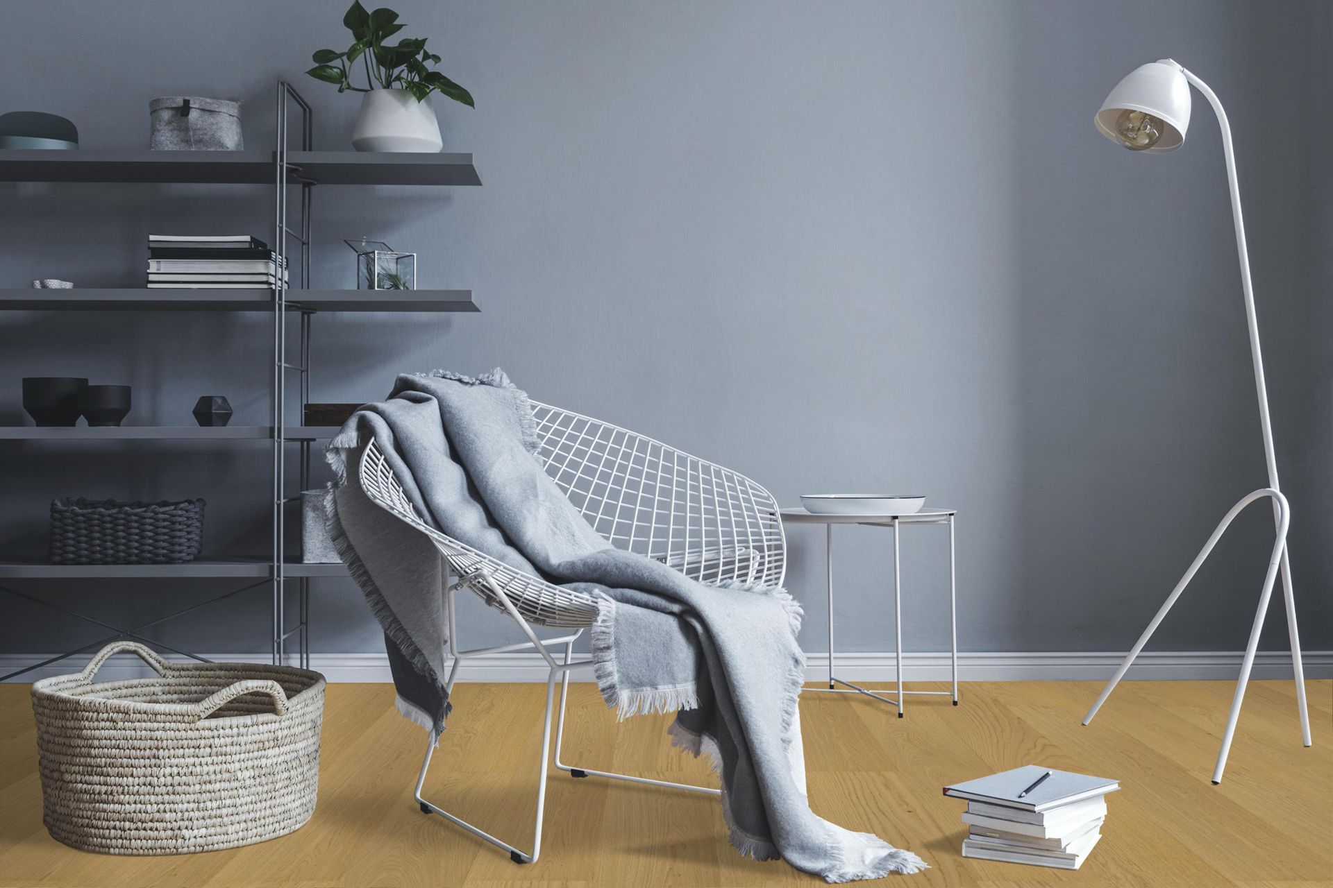 Die helle, elegante Holzoptik im Farbton „Natural Bale“ verleiht Räumen eine stilvolle und moderne Atmosphäre. Dank Synchronprägung und Echtholzoberfläche entsteht eine besonders authentische Haptik und Optik. Die klassische 1-Stab Landhausdiele mit umlaufender 4V-Fuge sorgt für ein realistisches Dielenbild und unterstreicht den hochwertigen Charakter des Bodens.
