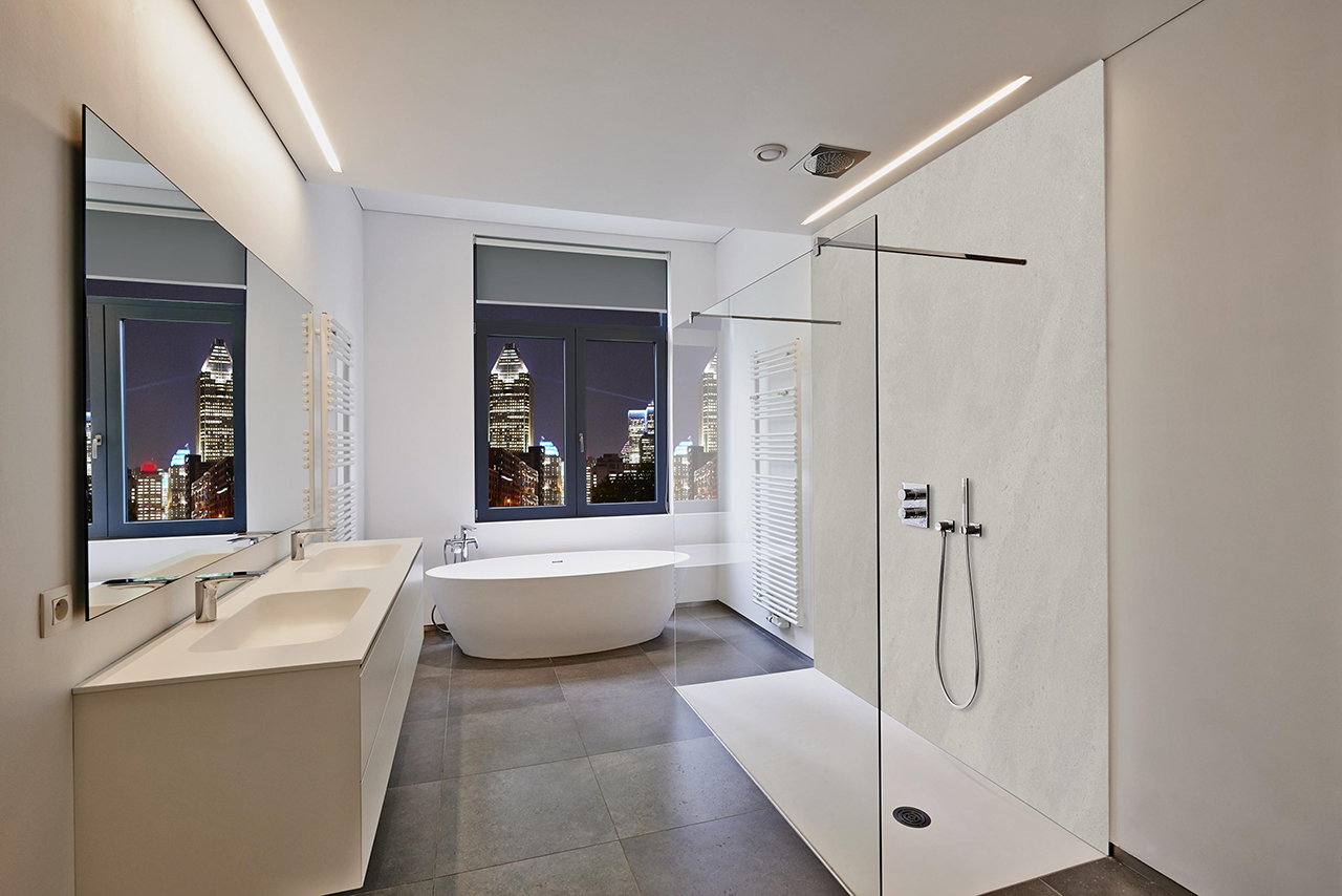 Wandfliese XXL - Check Smart Wall Tile | Sichtbeton Zement-Grau | Hochglanz | 1120 x 3050 x 8 mm